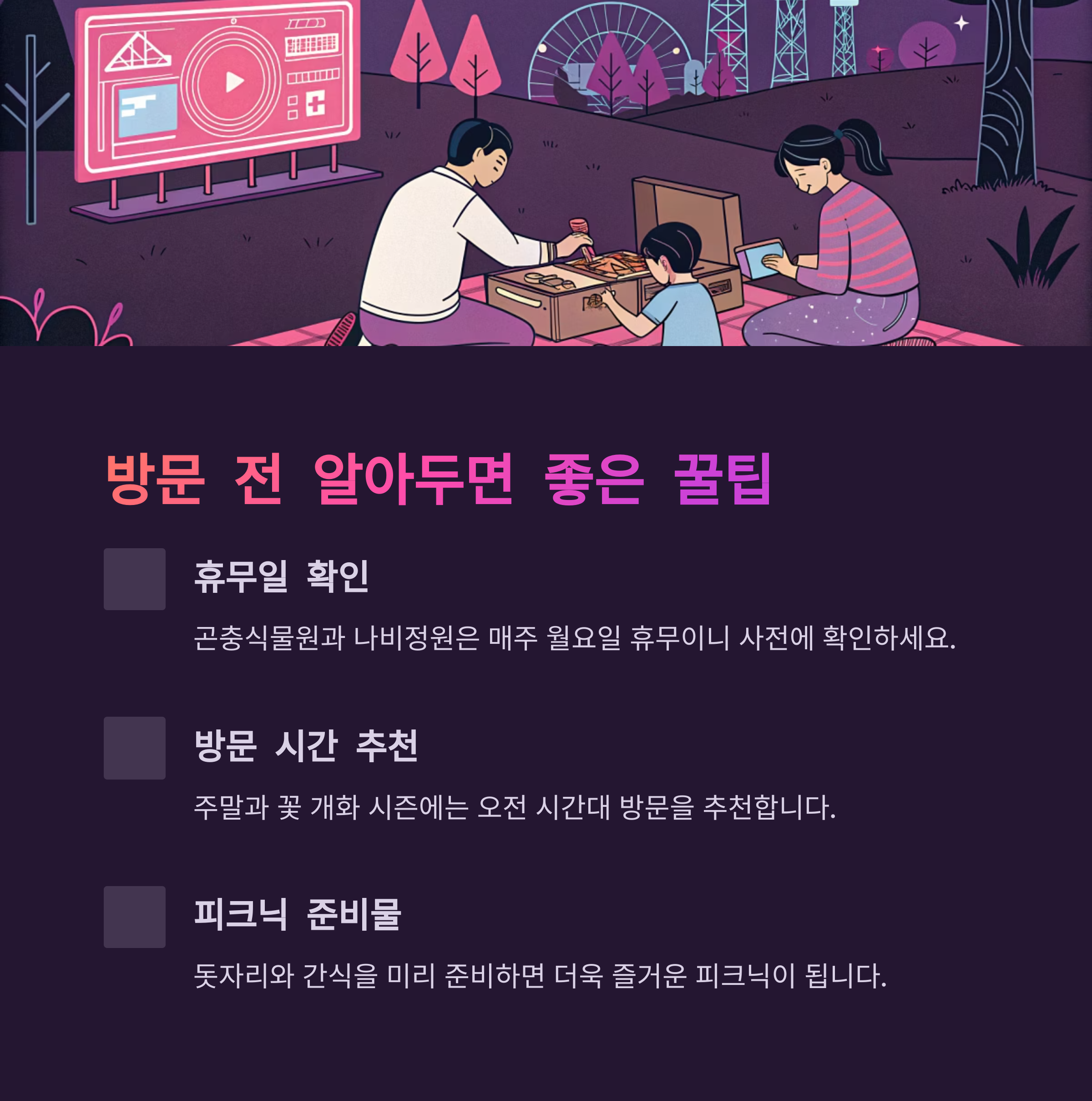 - 곤충식물원과 나비정원은 월요일 휴무이므로 사전 확인이 필요하다.
